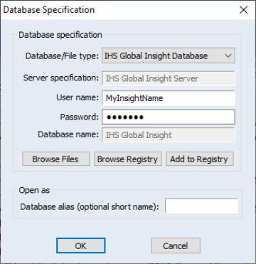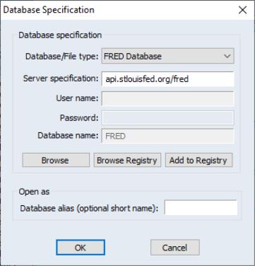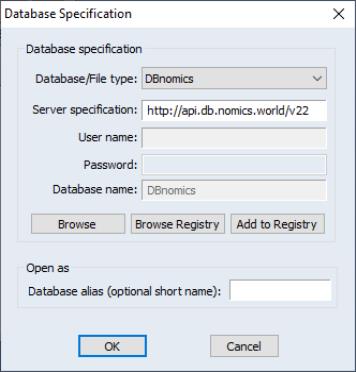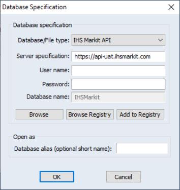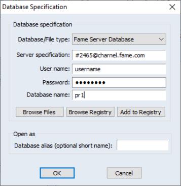 If the database is accessed through a client-server model, selecting the dialog will change to show extra fields necessary for making the connection to the server. For example, when accessing a database located on a FAME server, the dialog will include fields for the FAME server, username and password.