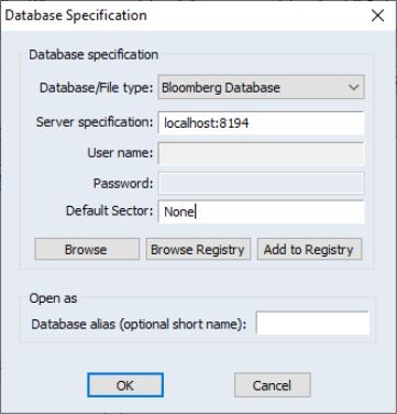 To start, you must open a database window to Bloomberg by selecting from the main EViews menus, then selecting from the dropdown menu. The following dialog should appear: