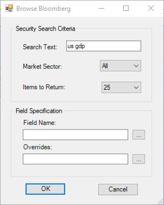 The first step in retrieving data is to find a series that we would like to fetch. Click on to bring up the Bloomberg database custom search dialog:
