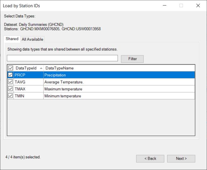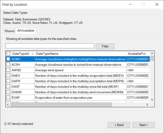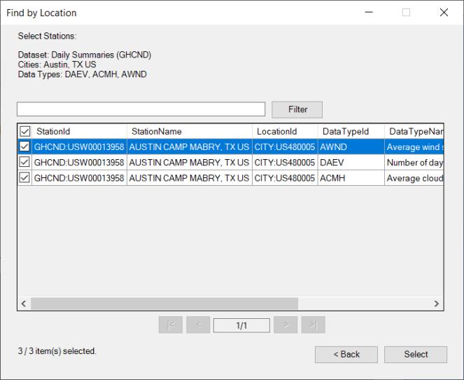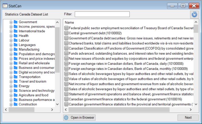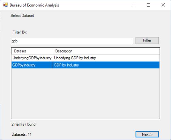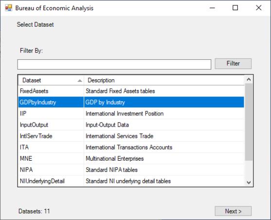 You can type a keyword in the Filter edit field to find a dataset. Select the dataset and click Next to continue.