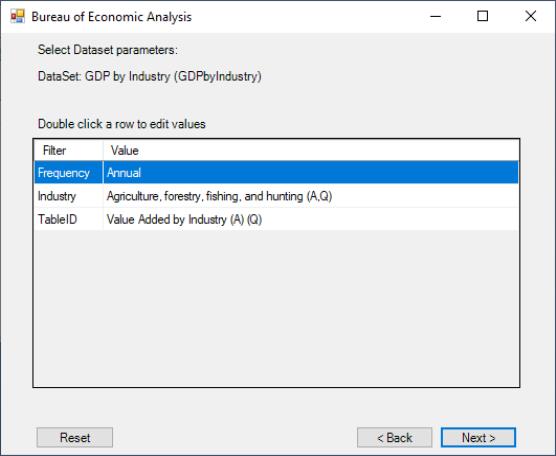 Select a dataset and click the button. A dialog with a list of dataset parameters will be shown, which will allow you to filter and customize the search results of the available series objects in the selected dataset. The default parameters are displayed under the column of the data table. Double click the row the change the default values.