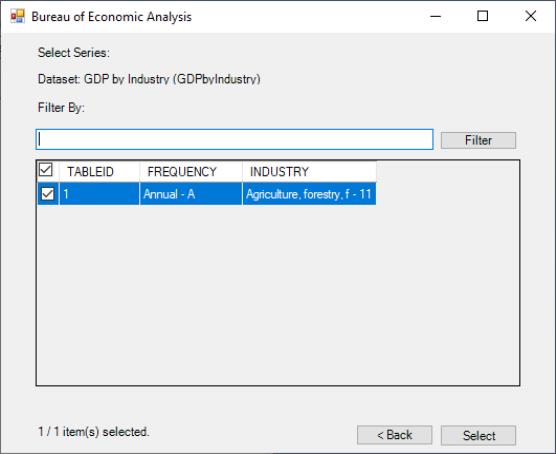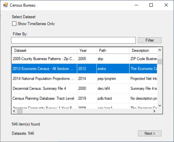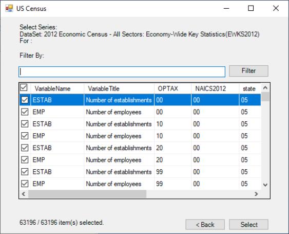 Once you finish selecting geography and required variables information, a dialog that contains a table with all the available series is displayed. The interface provides a way to search through the series by typing a keyword in the textbox and clicking the button.