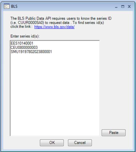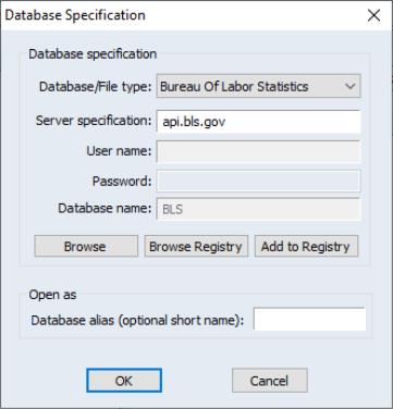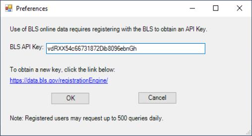 Use of the BLS service is free but requires registration. The first time you attempt to open the database you will be asked to enter an API Key obtained from the Bureau of Labor Statistics: