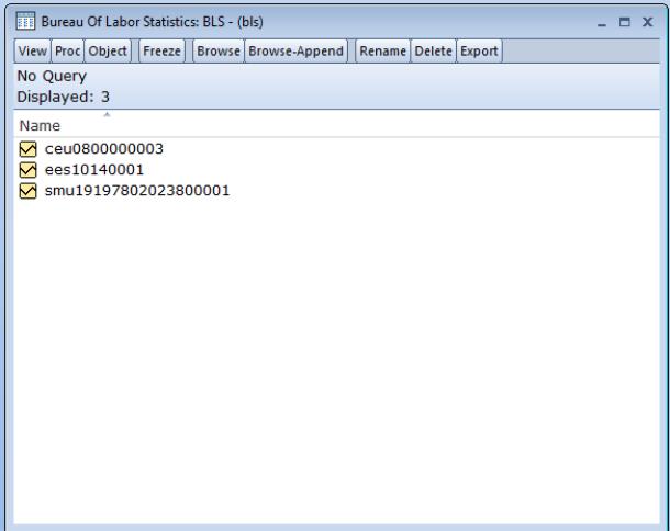 The browser window displays an edit box where the user can type or one or more series IDs to be retrieved from BLS. In the example above the edit box contains three typed series. After clicking , the regular EViews database window will be restored and will contain any requested series.