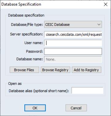To access a CEIC database, select and select in the drop-down menu and fill out your and as prompted. The Sever specification is pre-filled with the CEIC default, but you may enter the specification information for a different server if desired: