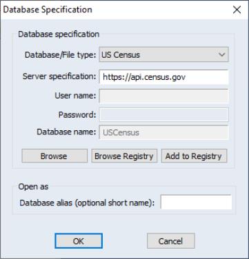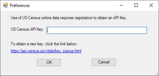Use of the Census service is free but requires registration. The first time you attempt to open the database you will be asked to enter an API Key obtained from the United States Census Bureau: