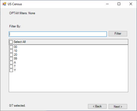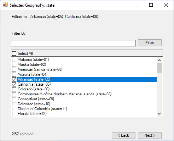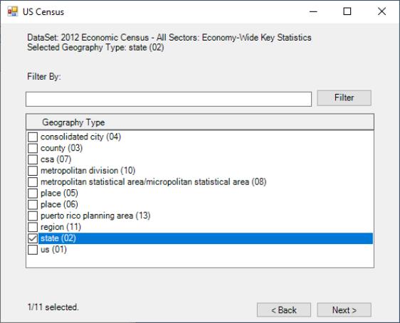 The majority of Census datasets require the user to specify geographic information in order to customize and limit the data result. After selecting the geography type, click to navigate to the next dialog. You might need to navigate to a number of dialogs until the geographic order is met: