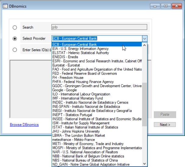 Alternatively, for SDMX databases that do not offer categorization information, the dialog interface simply offers a list of the available databases: