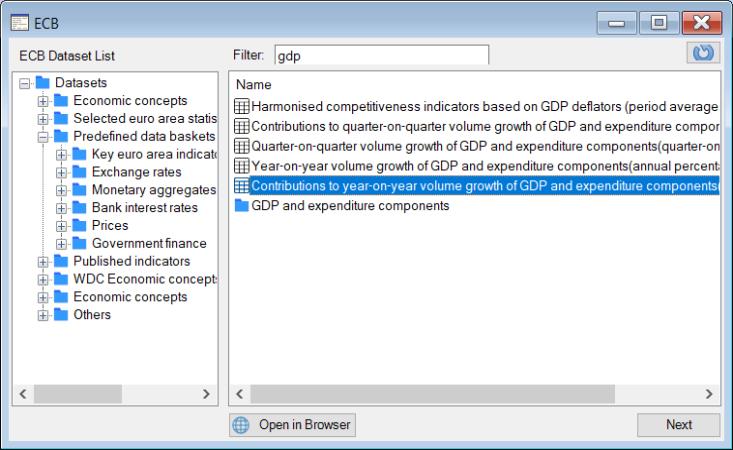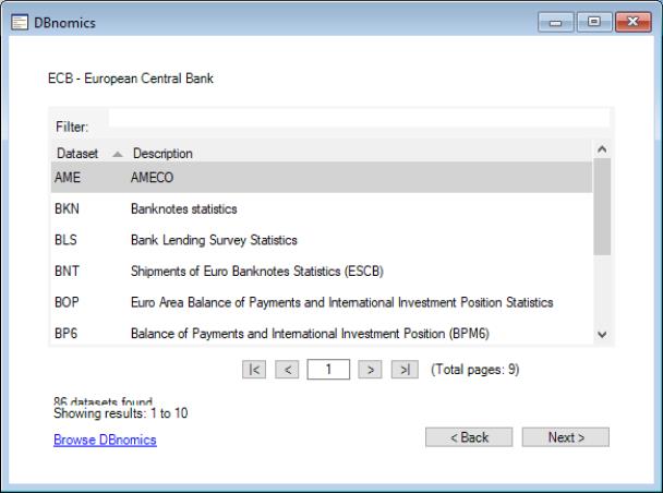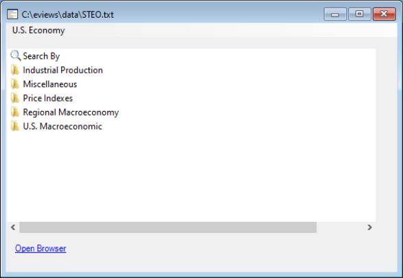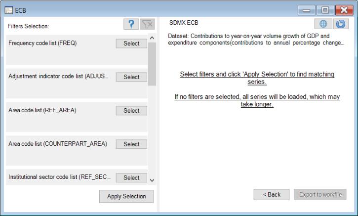 EViews offers one of two different interfaces for selecting a SDMX database: a tree structure navigator and filter for databases that offer dataset categorization information, and a simple scroll and filter interface for databases without categorization information.