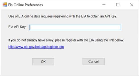 Please enter your API key and then click on OK. The key will be saved as a user specific setting in your EViews ".ini" file. If you need to change the key at a later time, select from the EViews database menu to modify your settings.