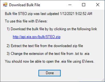 Please enter your API key and then click on . The key will be saved as a user specific setting in your EViews “.ini” file. If you need to change the key at a later time, select from the EViews database menu to modify your settings.