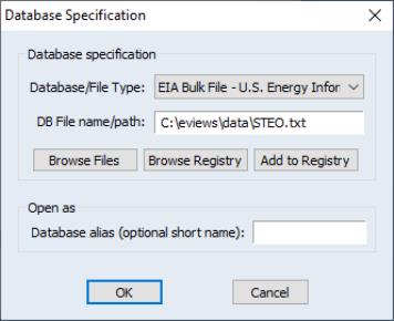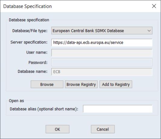 To begin, open the database windows by selecting File/Open Database from the primary EViews menu, select the desired SDMX database from the Database/File type drop down menu,