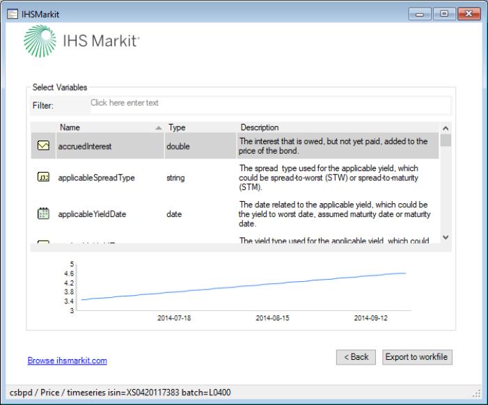 The dialog displays the available datasets. The checkbox is checked by default. Uncheck the box if you want to see all available datasets. The browser interface to the datasets provides a way to search through the datasets by typing a keyword in the textbox and clicking the button. Select a dataset and click the button. A dialog with a list of variables will be shown, which will allow you to filter and customize the search results of the available series objects in the selected dataset: