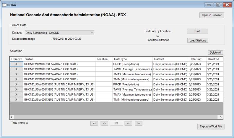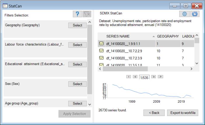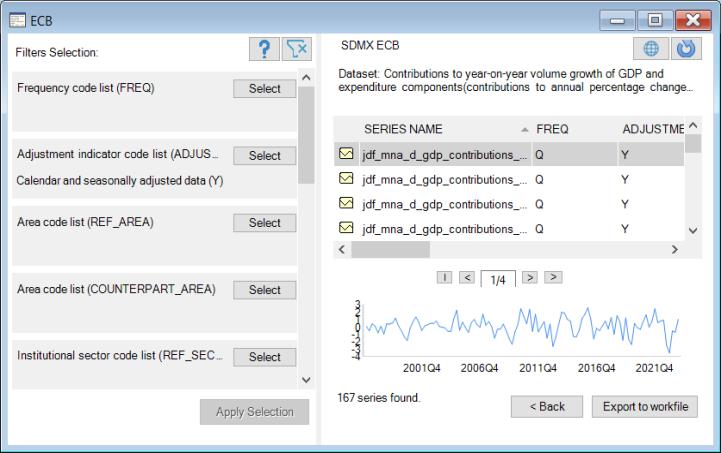 Finally, you may select one or more series in the list, then click on the Export to workfile button to load the selected series into a new or existing workfile.
