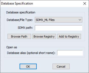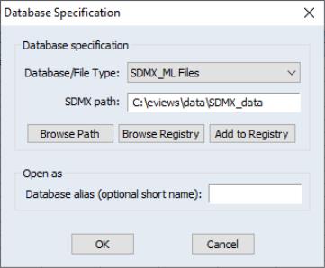 To start, you must open a database window to SDMX-ML by selecting File/Open Database… from the main EViews menus, then selecting SDMX-ML files from the dropdown menu. The following dialog should appear: