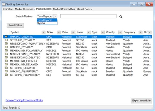 If any of the market tabs (, , , ) are selected, the dialog will display a table with all the stock market symbol results you have permission to see based on your subscription. For example, the below dialog shows the tab: