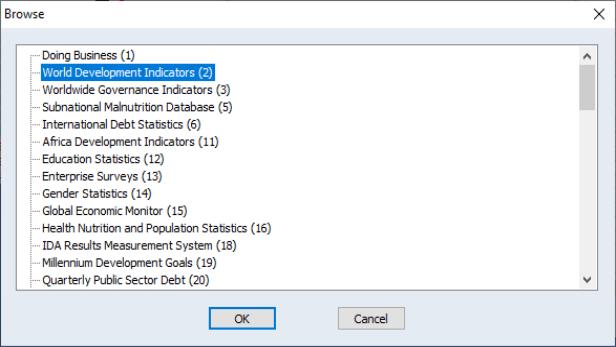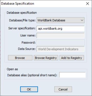 The database window represents a connection to the data. Click on or , which opens a new custom World Bank database. Click on the folder icons to move down into subtopics: