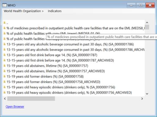 The browser allows you to find data available within the World Bank by navigating through a set of nested folders. Simply click on any folder to move inside it.