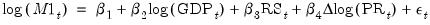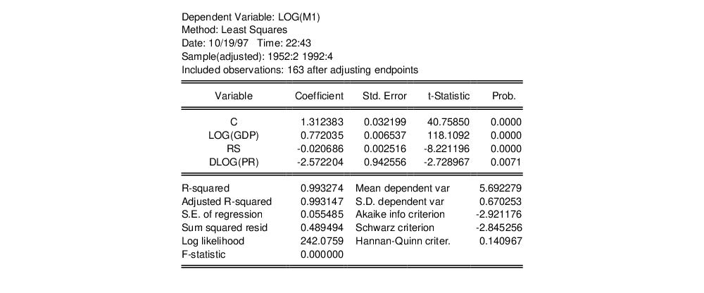 where log(M1) is the logarithm of the money supply, log(GDP) is the log of income, RS is the short term interest rate, and