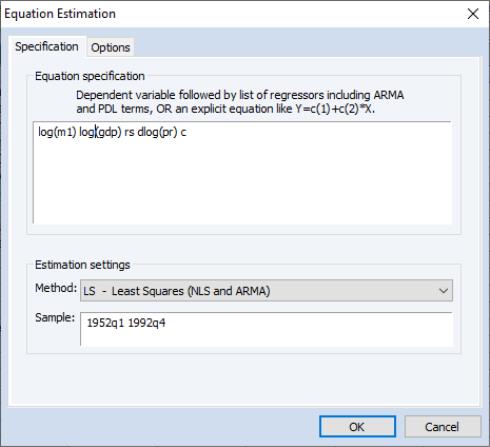 The dialog is initialized to estimate the equation using the LS - Least Squares method for the sample 1952Q1 1996Q4. You should change text in the Sample edit box to “1952Q1 1992Q4” or equivalently “1952 1992” to estimate the equation for the subsample of observations.