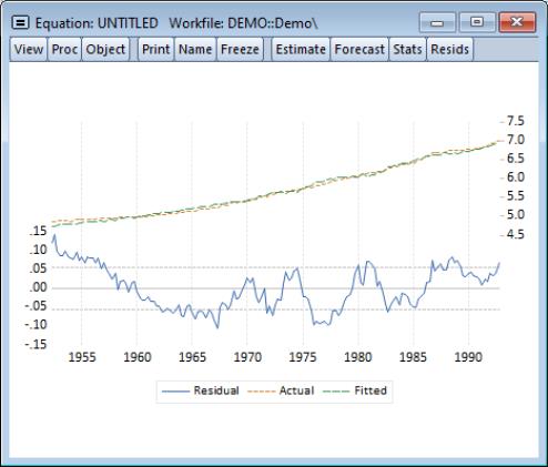 value, indicates a very tight fit. You can select in the equation toolbar to display a graph of the actual and fitted values for the dependent variable, along with the residuals: