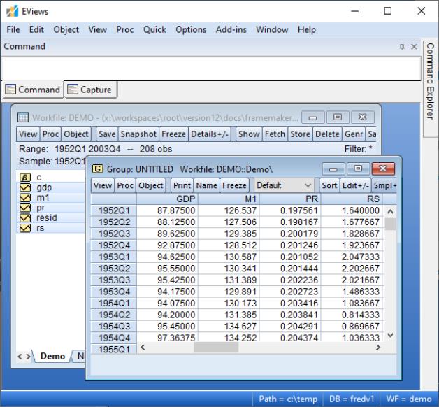 When you accept the settings, EViews automatically creates a workfile that is sized to hold the data, and imports the series into the workfile. The workfile ranges from 1952 quarter 1 to 1996 quarter 4, and contains five series (GDP, M1, OBS, PR, and RS) that you have read from the Excel file. There are also two objects, the coefficient vector C and the series RESID, that are found in all EViews workfiles.