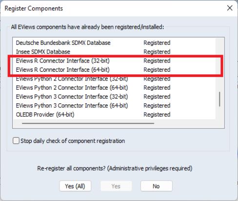 In the Register Components dialog, make sure that the EViews R Connector Interface objects have been properly registered. If not, click the button to re-register these components on your local machine, then re-run REGCOMPONENTS to verify the registration. Note: Registration of these components will require local administrator rights. If you do not have these admin rights, please contact your IT department for support.