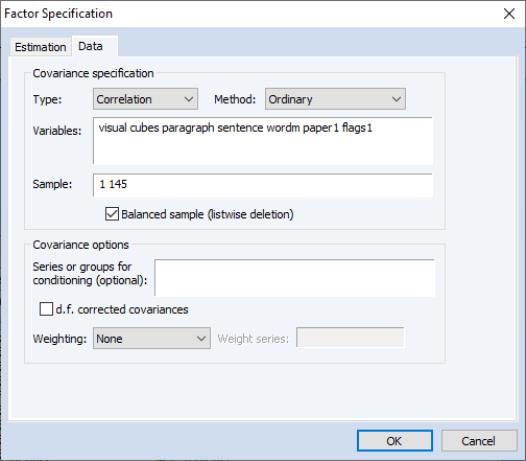 When the factor object created in this fashion, EViews will pre-define a specification based on the series in the group. You may click on the tab to see the pre-filled settings. Here, we see that EViews has entered in the names of the seven series in G7.