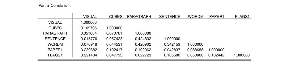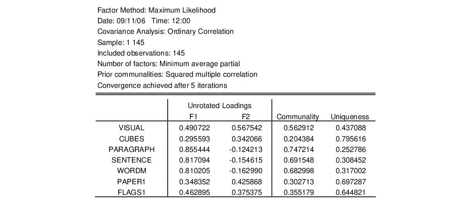 We illustrate the basic features of the factor object by analyzing a subset of the classic Holzinger and Swineford (1939) data, consisting of measures on 24 psychological tests for 145 Chicago area children attending the Grant-White school (Gorsuch, 1983). A large number of authors have used these data for illustrating various features of factor analysis. The raw data are provided in the EViews workfile “Holzinger24.WF1”. We will work with a subset consisting of seven of the 24 variables: VISUAL (visual perception), CUBES (spatial relations), PARAGRAPH (paragraph comprehension), SENTENCE (sentence completion), WORDM (word meaning), PAPER1 (paper shapes), and FLAGS1 (lozenge shapes).