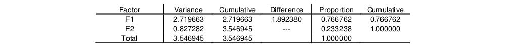 ) of the total variance (sum of the diagonals of the correlation matrix). Furthermore, we see that the first factor F1 accounts for 77% (