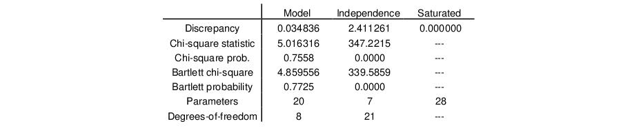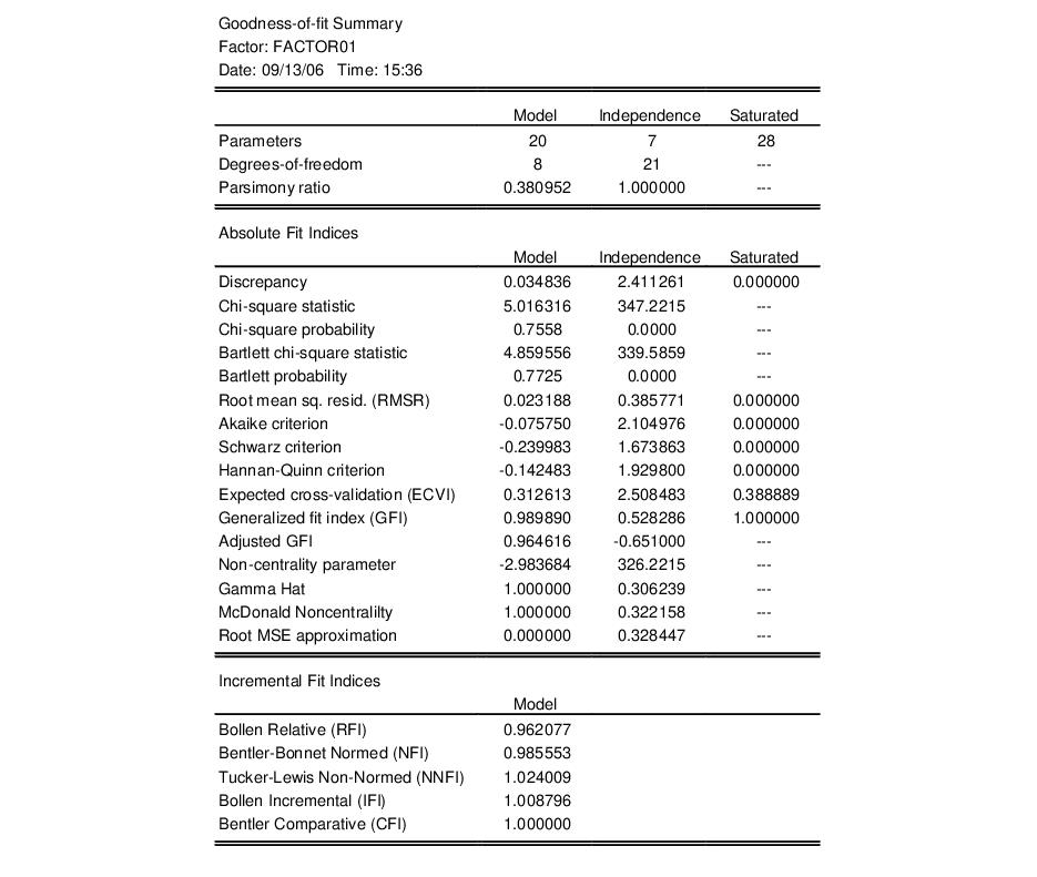 As you can see, EViews computes a large number of absolute and relative fit measures. In addition to the discrepancy, chi-square and Bartlett chi-square statistics seen previously, EViews computes scaled information criteria, expected cross-validation indices, generalized fit indices, as well as various measures based on estimates of noncentrality. Also presented are incremental fit indices which compare the fit of the estimated model against the independence model (see