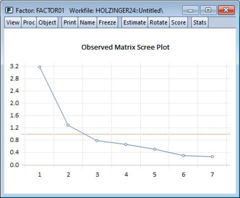 Click on to accept the settings. EViews will display the scree plot for the data, along with a line indicating the average eigenvalue.