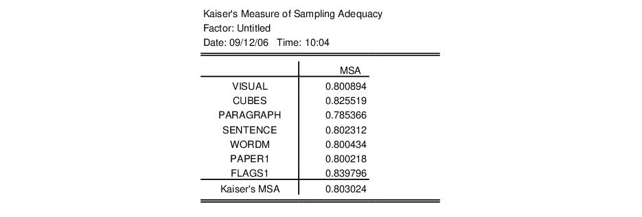 To examine the Kaiser Measure of Sampling Adequacy, select . The top portion of the display shows the individual measures and the overall of MSA (0.803) which falls in the category deemed by Kaiser to be “meritorious”.