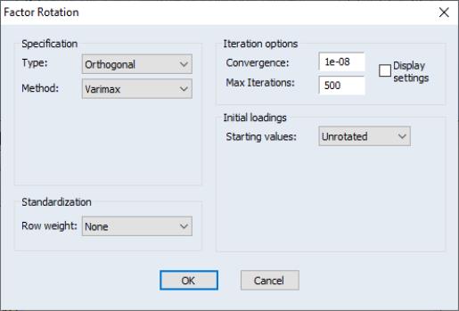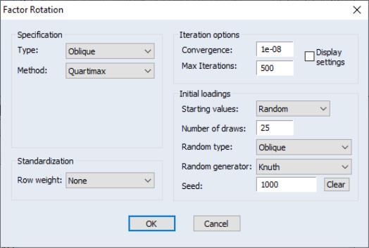Factor rotation may be used to simplify the factor structure and to ease the interpretation of factors. For this example, we will consider one orthogonal and one oblique rotation. To perform a factor rotation, click on the button on the factor toolbar or select from the main factor menu.