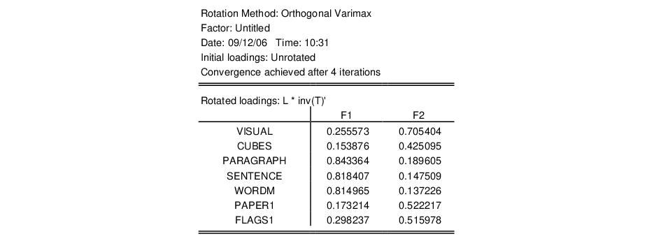 We first see that Velicer’s MAP method has retained two factors, labeled “F1” and “F2”. A brief examination of the unrotated loadings indicates that PARAGRAPH, SENTENCE and WORDM load on the first factor, while VISUAL, CUES, PAPER1, and FLAGS1 load on the second factor. We therefore might reasonably label the first factor as a measure of verbal ability and the second factor as an indicator of spatial ability. We will return to this interpretation shortly.