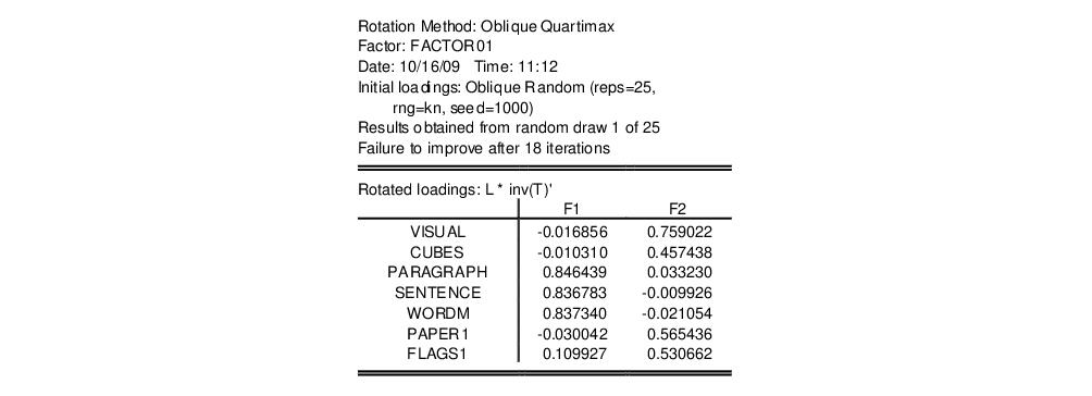 The top portion of the results shows information on the rotation method and initial loadings. Just below the header are the rotated loadings. Note that the relative importance of the VISUAL, CUBES, PAPER1, and FLAGS1 loadings on the second factor is somewhat more apparent for the oblique factors.