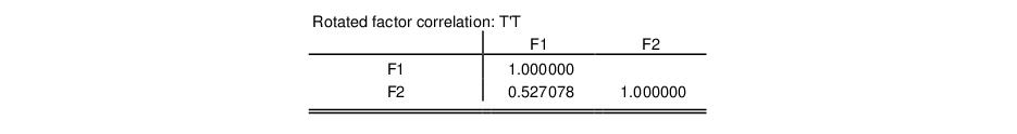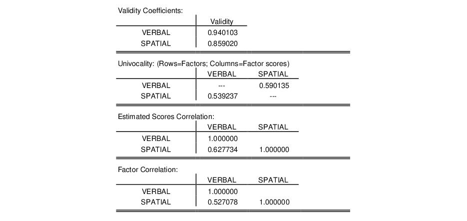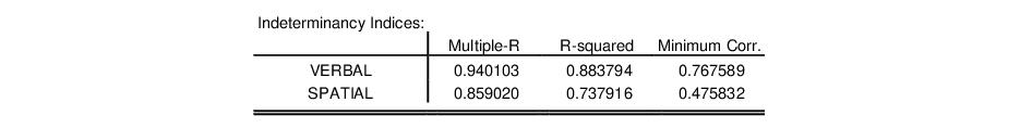 The indeterminacy indices show that the correlation between the estimated factors and the variables is high; the multiple correlation for the first factor well over 0.90, while the correlation for the second factor is around 0.85. The minimum correlation indices are also reasonable, suggesting that alternative factor score solutions are highly correlated. At a minimum, the correlation between two different measures of the SPATIAL factors will be nearly 0.50.