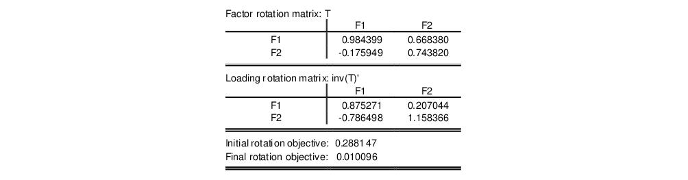 The factor rotation dialog is used to specify the rotation method, row weighting, iteration control, and choice of initial loadings. We begin by accepting the defaults which rotate the initial loadings using orthogonal Varimax. EViews will perform the rotation and display the results.