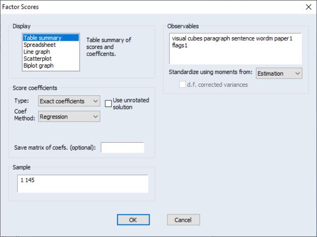 Click on to bring up the factor score dialog. As you can see, there are several ways to estimate the factors and several views of the results. For now, we will focus on displaying a summary of the factor score regression estimates, and in producing a biplot of the scores and loadings.