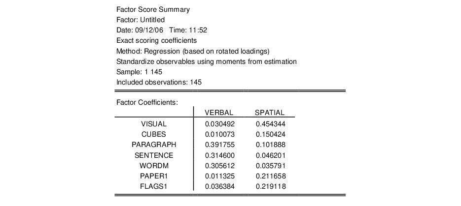 To save scores to the workfile, select and fill out the dialog. The procedure dialog differs from the view dialog only in the section. Here, you should enter a list of scores to be saved or a list of indices for the scores. Since we have previously named our factors, we may specify the indices “1 2” and click on . EViews will open an untitled group containing the results saved in the series VERBAL and SPATIAL.
