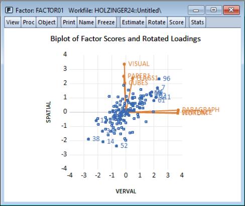 Now, let us display the graph of the rotated loadings. Click on and simply click on to accept the defaults. EViews displays the rotated loadings graph. Note the clear separation between the sets of tests.