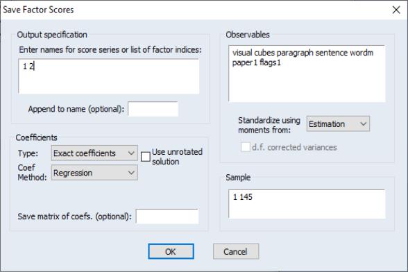 The default method of producing scores is to use exact coefficients from Thurstone’s regression method, and to apply these coefficients to the observables data used in factor extraction.