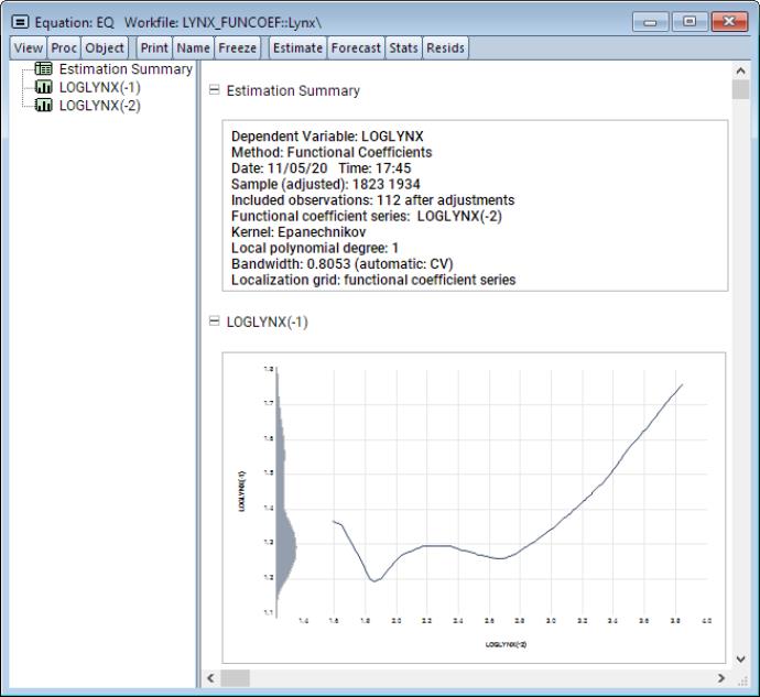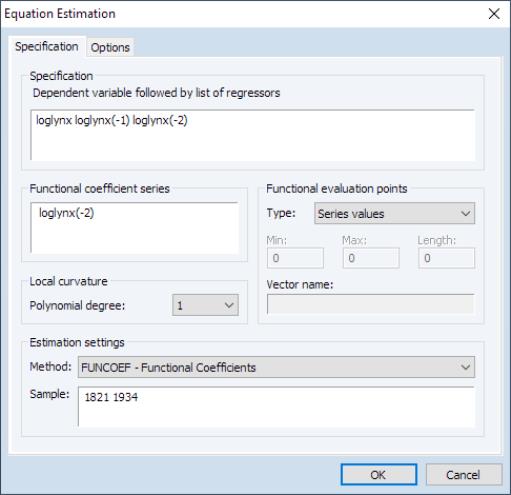 • In the edit field you should enter your dependent variable followed by a list of functional coefficient regressors. Here, LOGLYNX is the dependent variable, and the two lag variables LOGLYNX(-1) and LOGLYNX(-2) will have functional coefficients.