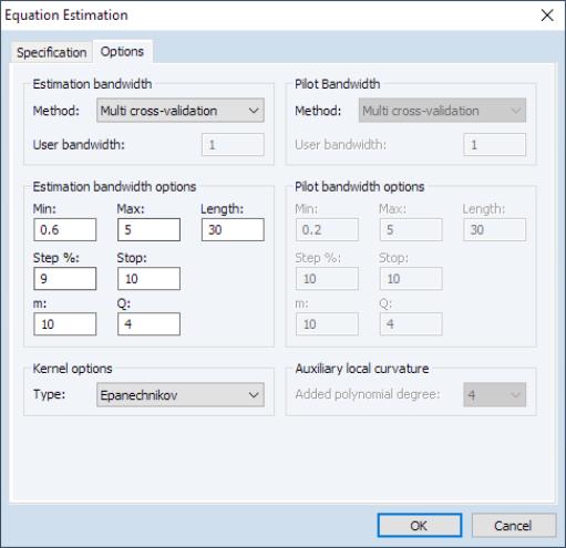 • Associated with the automated bandwidth methods are bandwidth search options specifying the , , , , and settings. The first three set the minimum, maximum, and length of the bandwidth grid over which to search for an optimal bandwidth. The last two determine the increment by which to increase the grid value when searching, and how many consecutive failures to improve upon the optimal bandwidth are permitted before the search is terminated. Note here that the search also terminates whenever either the maximum is reached, or the number of bandwidths searched reaches the length specified. Furthermore, when the bandwidth mechanism is , the number of forecast steps is specified in the edit field, and the number of sub-series to evaluate may be specified under (see