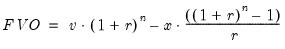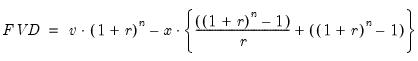 Compute future (negative) value of payment of an n-period annuity, with payments x and rate r, and optional receipt of (positive) initial lump sum v.