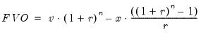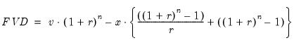 Compute future (negative) value of payment of an n-period annuity, with payments x and rate r, and optional receipt of (positive) initial lump sum v.