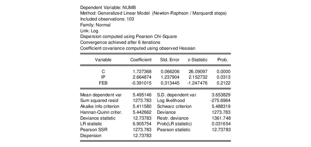 The bottom portion of the output displays various descriptive statistics. Note that in place of some of the more familiar statistics, EViews reports the deviance, deviance statistic (deviance divided by the degrees-of-freedom) restricted deviance (for the model with only a constant), and the corresponding LR test statistic and probability. The test indicates that the IP and FEB variables are jointly significant at roughly the 3% level. Also displayed are the sum-of-squared Pearson residuals and the estimate of the dispersion, which in this example is the Pearson statistic.
