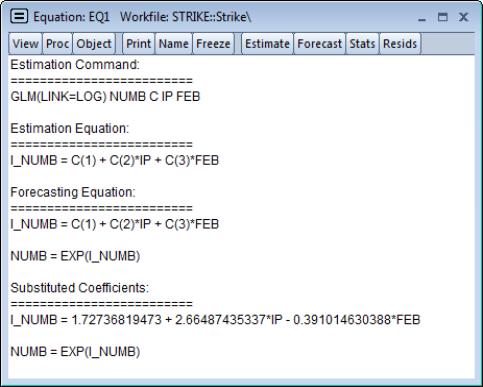 Notably, the representations view displays both the specification of the linear predictor (I_NUMB) as well as the mean specification (EXP(I_NUMB)) in terms of the EViews coefficient names, and in terms of the estimated values. These are the expressions used when forecasting the index or the dependent variable using the procedure (see