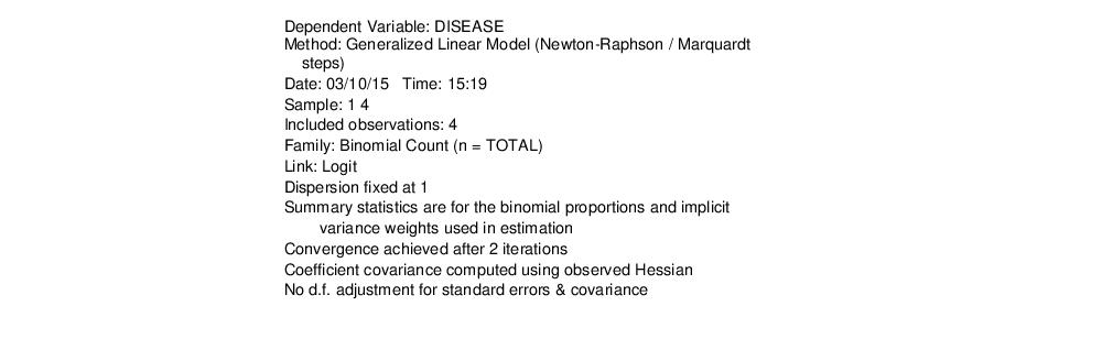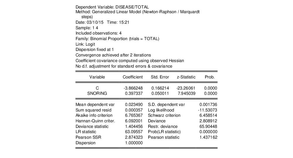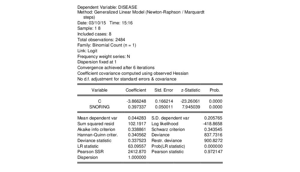 We illustrate the estimation of GLM binomial logistic regression using a simple example from Agresti (2007, Table 3.1, p. 69) examining the relationship between snoring and heart disease. The data in the first page of the workfile “Snoring.WF1” consist of grouped binomial response data for 2,484 subjects divided into four risk factor groups for snoring level (SNORING), coded as 0, 2, 4, 5. Associated with each of the four groups is the number of individuals in the group exhibiting heart disease (DISEASE) as well as a total group size (TOTAL).