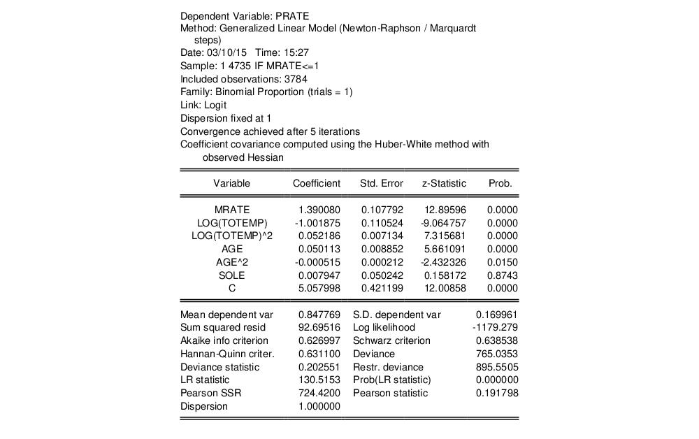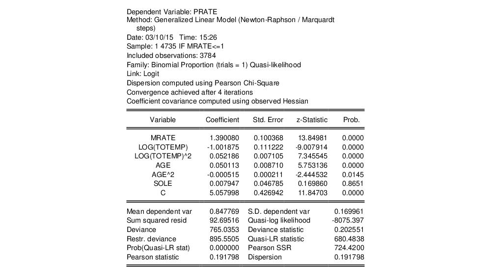 Papke and Wooldridge (1996) apply GLM techniques to the analysis of fractional response data for 401K tax advantaged savings plan participation rates (“401kjae.WF1”). Their analysis focuses on the relationship between plan participation rates (PRATE) and the employer matching contribution rates (MRATE), accounting for the log of total employment (LOG(TOTEMP), LOG(TOTEMP)^2), plan age (AGE, AGE^2), and a binary indicator for whether the plan is the only pension plan offered by the plan sponsor (SOLE).